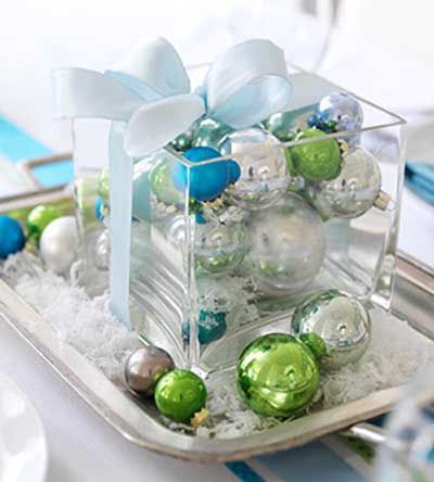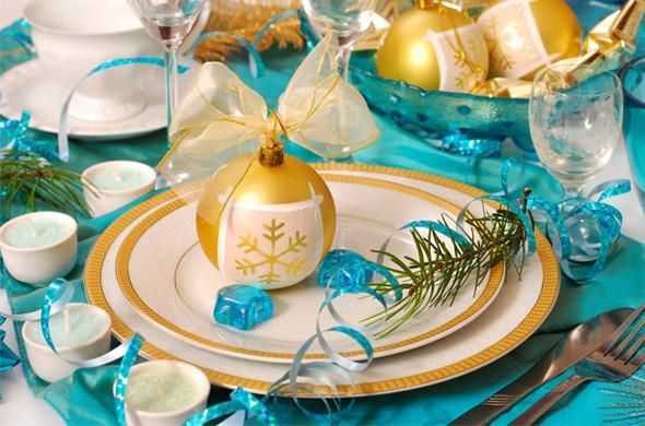 En ocasiones un simple mantel blanco con un lindo camino de mesa en color turquesa o azul oscuro, completado con pequeños centros sencillos de elaborar, utilizando bolas navideñas y lazos en cuencos o jarrones de cristal, pueden darte la clave para obtener un aspecto sencillamente encantador. También puede resultar muy interesante la combinación inversa, manteles azules o turquesas combinados con vajillas y servilletas blancas con toques dorados que aportan festividad a tu mesa.